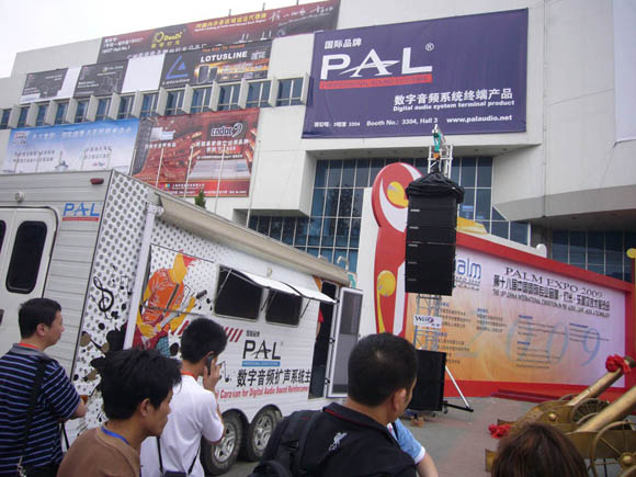 沿展馆正门而入,即看到1号馆主场馆上方悬挂着多幅大小不一的企业宣传牌,C-MARK、PAL两幅面积达100余平米的品牌宣传牌雄踞在左右两侧,甚为显眼、大气。宣传牌正下方即是开幕式现场,宝业恒两列大型线阵音箱高高悬挂在舞台两侧,每列线阵的下面,则停放着1台移动式数字音频主控车,所有开幕式的音频扩声控制均在主控车中完成。“迄今已举办18届展会开幕式的现场首次出现音频控制车,宝业恒为国际音响展带来了新的创举。”一主办方领导如此说道。